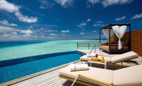 Located in the UNESCO Biosphere Reserve, this resort has its own lounge at the airport. Branding itself ‘big on experience’, the resort does offer some exciting options like an infinity pool, private jet tours, snorkeling expeditions with Manta Rays, reef diving and luxury yacht charter to explore the scenic surroundings. The over water accommodations are nothing short of ultra-luxury with its high ceilings, timber interiors & amenities that leave you craving for more.